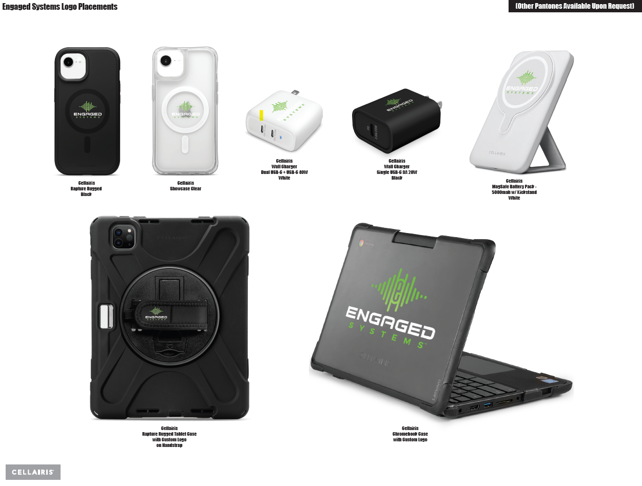 Cellairis offers a range of customization options intended to help show off YOUR BRAND with custom logo printing and pantone colors for nearly all of our core products. Speak to your sales representative for more information.